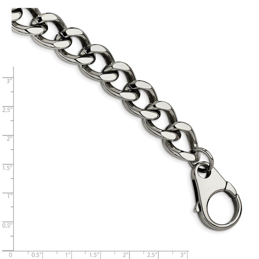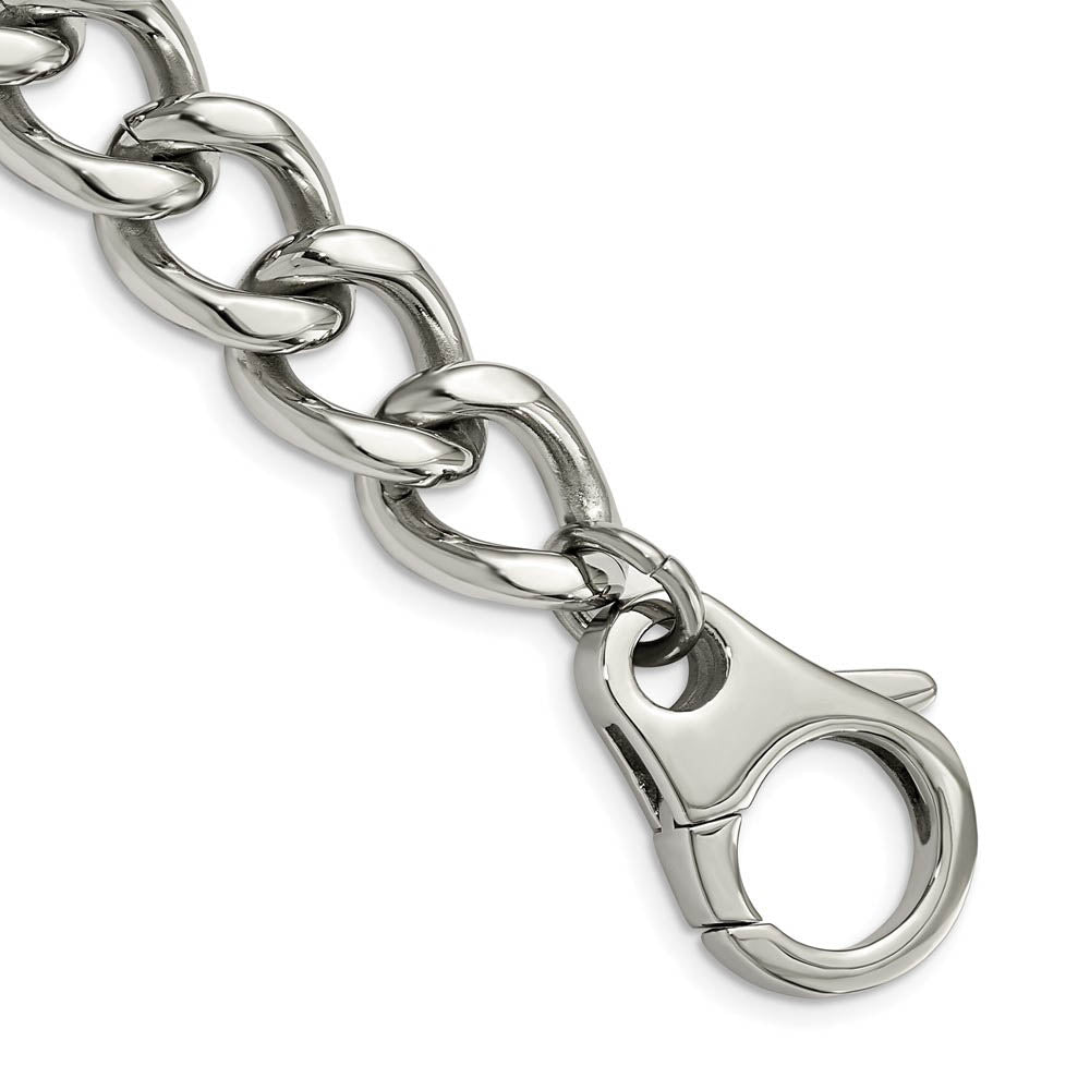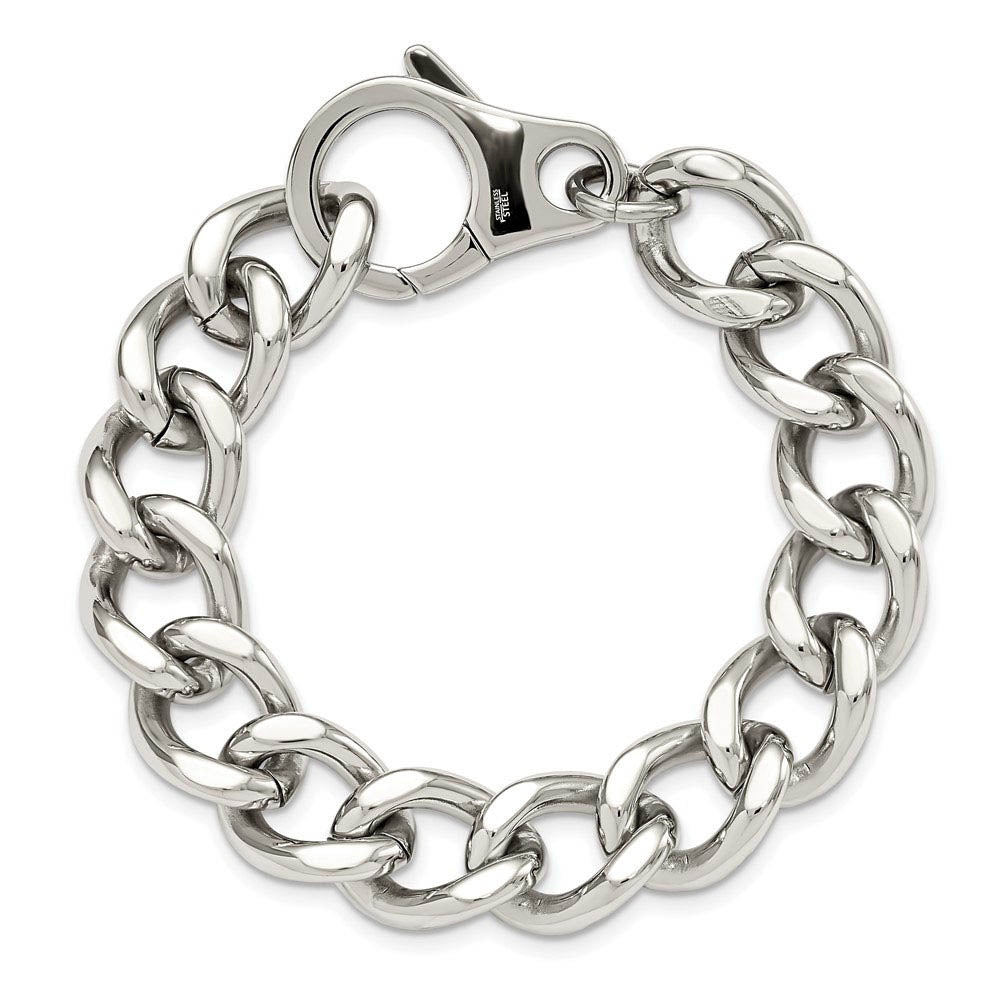 Big, bold and impressive! The clean sleek styling of this stainless steel bracelet features a classic curb chain with a high polished finish. It measures approximately 15mm in width by 8.5 inches in length including the fancy lobster clasp.