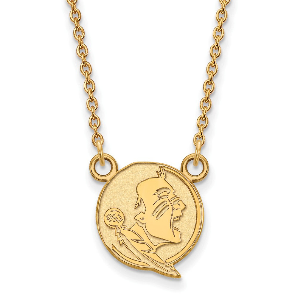 If you are a fan of Florida State University and the footbal team then you need to show your school spirit with this Florida State University necklace. We are a certified retailer and this authentic item is officially licensed. It is crafted from 14k yellow gold plated sterling silver and crafted in the USA. 18 inches in length. This item is not currently in-stock. Once you place your order, please allow us 5 to 7 business days to make it for you.