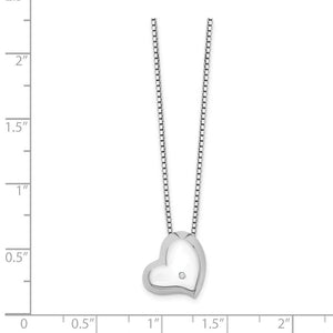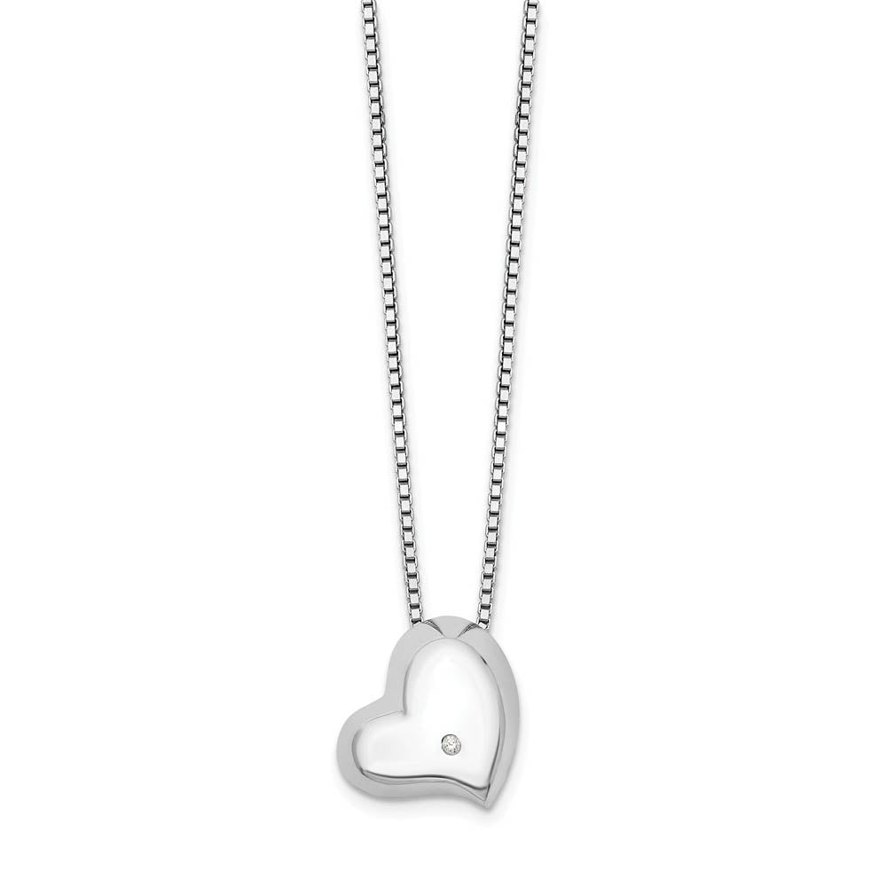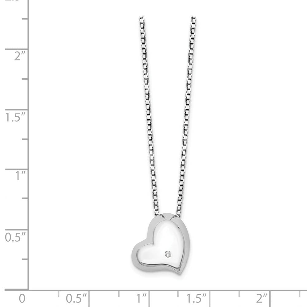 A timeless classic design featuring a diamond accented polished heart pendant with an adjustable chain made from tarnish resistant, rhodium-plated sterling silver. The offset, 3D open-back pendant is approximately 12mm (7/16 inch) in width by 13mm (1/2 inch) in length. It comes ready to wear on 1mm width, 18-inch long box chain finished with a spring ring clasp and 2-inch extension for flexibility. The natural .01-carat diamond is I2 in clarity and H-I in color.
