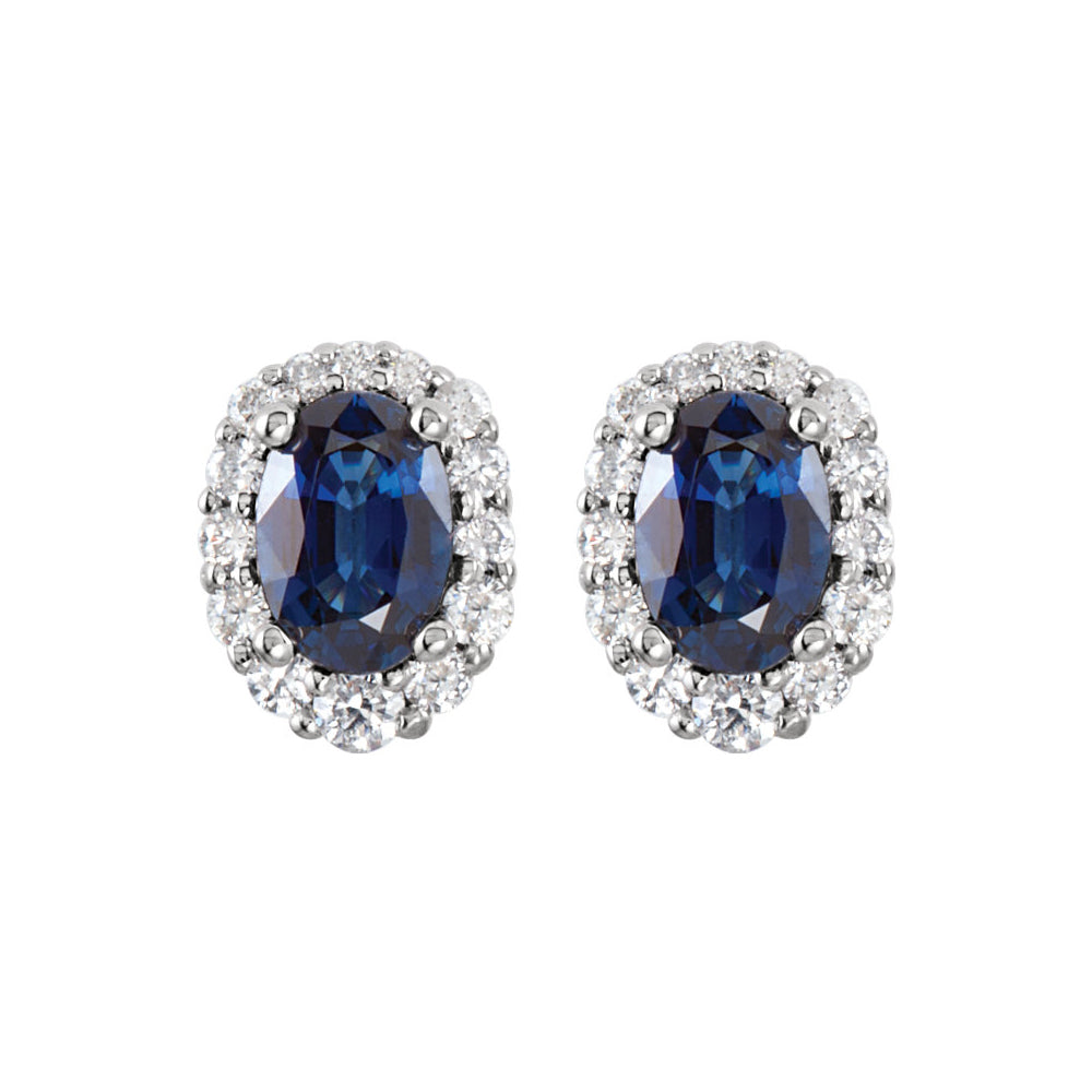 A halo of sparkling diamonds surrounds a faceted oval sapphire in this breathtaking pair of 14k white gold earrings. They are finished with a friction back post and measure approximately 6.5mm (1/4 inch) in width by 8mm (5/16 inch) in length. The 6 x 4mm genuine sapphires have a combined weight of 1.4 carats. The round diamonds vary in size, are I1 in clarity, G-H in color and have a total weight of 1/3 carat. The color range varies on all natural stones so please allow for slight variations in shades. Gemstone treatment: traditional heating process. Diamond treatment: natural, not enhanced.