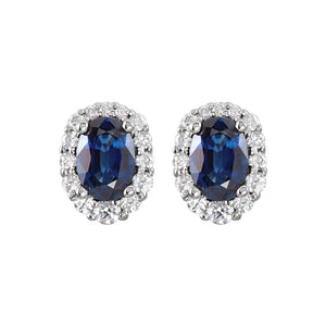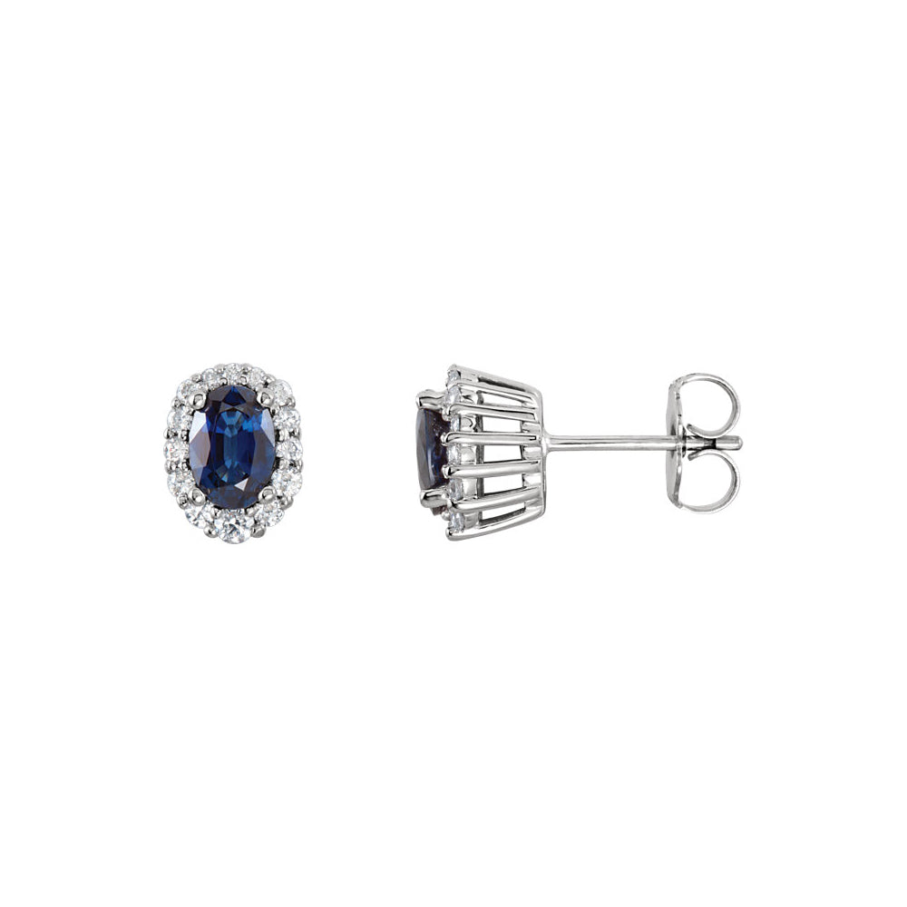 Oval Blue Sapphire & Diamond Halo Post Earrings in 14k White Gold - Black Bow Jewelry Company