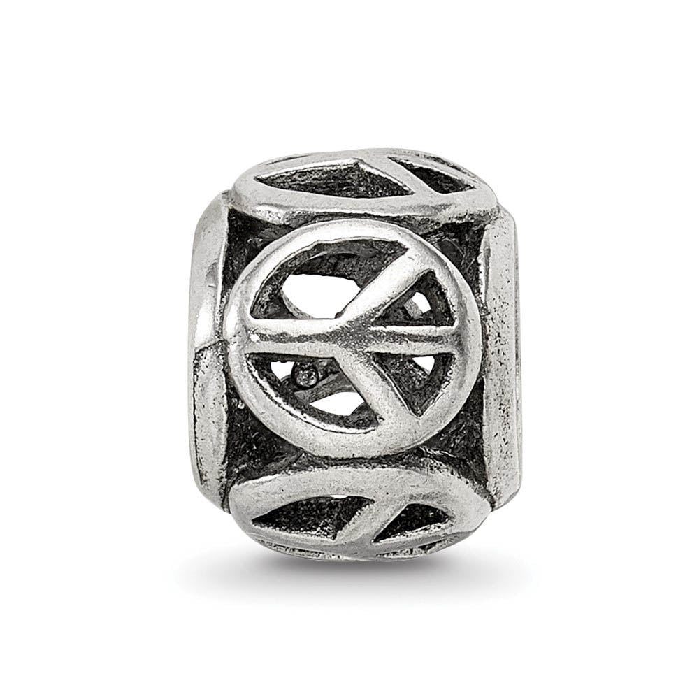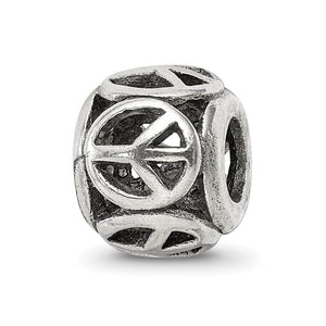 Add a chapter to your bead collection with a symbolic emblem charm designed to reveal your personal story. This antiqued sterling silver bead features a peace sign design that is approximately 8mm in width by 9mm in length and has a 4mm core. All of our charms are interchangeable as well as compatible with Reflections and other popular 3mm width bead style bracelets and necklaces.