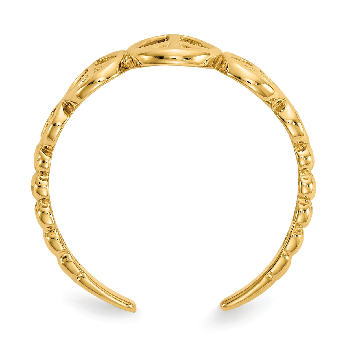 The internationally known, anti-war peace sign has been recreated in this incredible toe ring. It is crafted in the USA from polished, 14k yellow gold and measures 5mm wide. One size fits most.