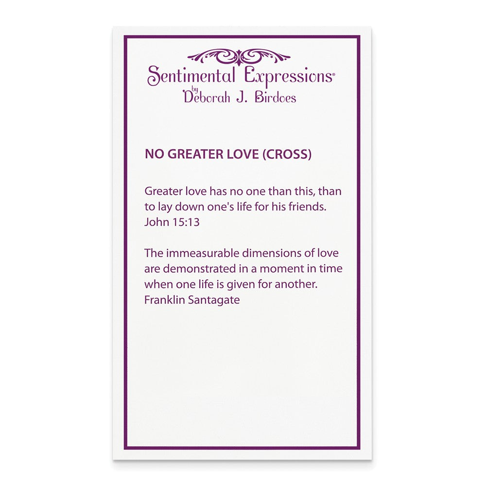 This Passion cross is crafted from rhodium and gold tone plated sterling silver and measures approximately 23mm (7/8 inch) in width by 52mm (2 inches) in length with the bail. Each cross includes an 18 inch cable chain finished with a spring ring clasp and inspirational message card printed in English and Spanish. Verse: Greater love has no one that this, than to lay down one's life for his friends. -John 15:13. The immeasurable dimensions of love are demonstrated in a moment in time when one life is given for another. - Franklin Santagate