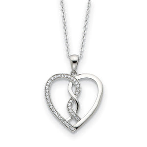 Make that special day even more memorable with this entwined heart necklace designed from rhodium plated sterling silver and sparkling cubic zirconia stones. Th pendant is approximate 25mm (1 inch) in width by 32mm (1 1/4 inch) in length with the bail. It includes an 18-inch long cable chain finished with a spring ring clasp and a card with the following inspirational poem written by the artist printed in English and Spanish. It has to be a miracle... Two hearts joined together. Our past and our future... Joined today for forever. Our souls are tied as one, Until eternity we'll stay. Sharing our lives together, On this much awaited day!