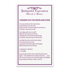 This dazzling celestial necklace is crafted from rhodium plated sterling silver and cubic zirconia. The hidden bail pendant is approximately 25mm (1 inch) in diameter by 50mm (1 7/8 inch) in length. The cable chain is 18 inches long and closes with a spring ring clasp. Each piece includes a card with the following inspirational poem by the artist and verse printed in English and Spanish. I Promise You the Moon and Stars. If I could climb to the heavenlies... I'd pick three stars for you. Each one for our past, present and future. To show I love you as I do. For today, with you is a gift... With all of its joy and sorrow. Holding the memories of yesterday... As well as the promise of tomorrow. Just like the stars and moon above... You illuminate my soul. Capturing my heart again and again... More than you'll ever know.