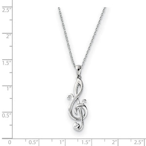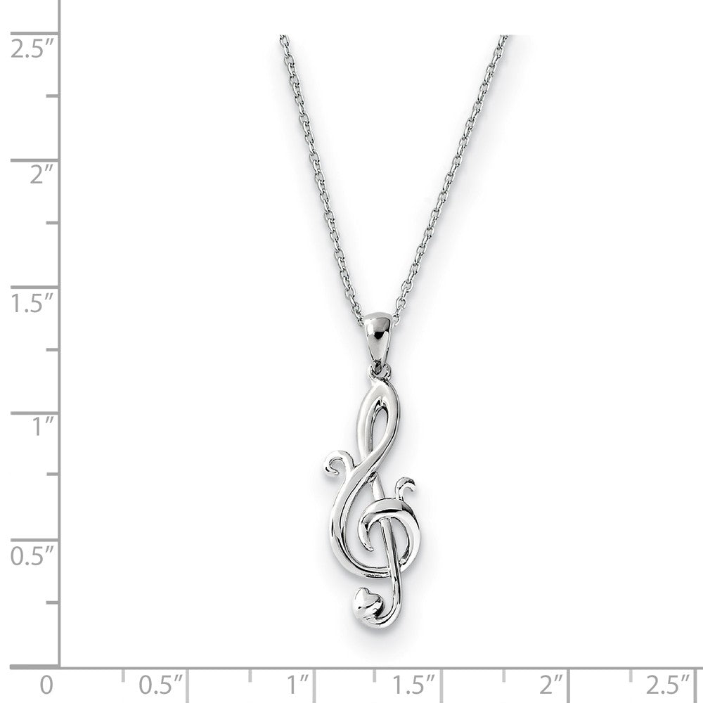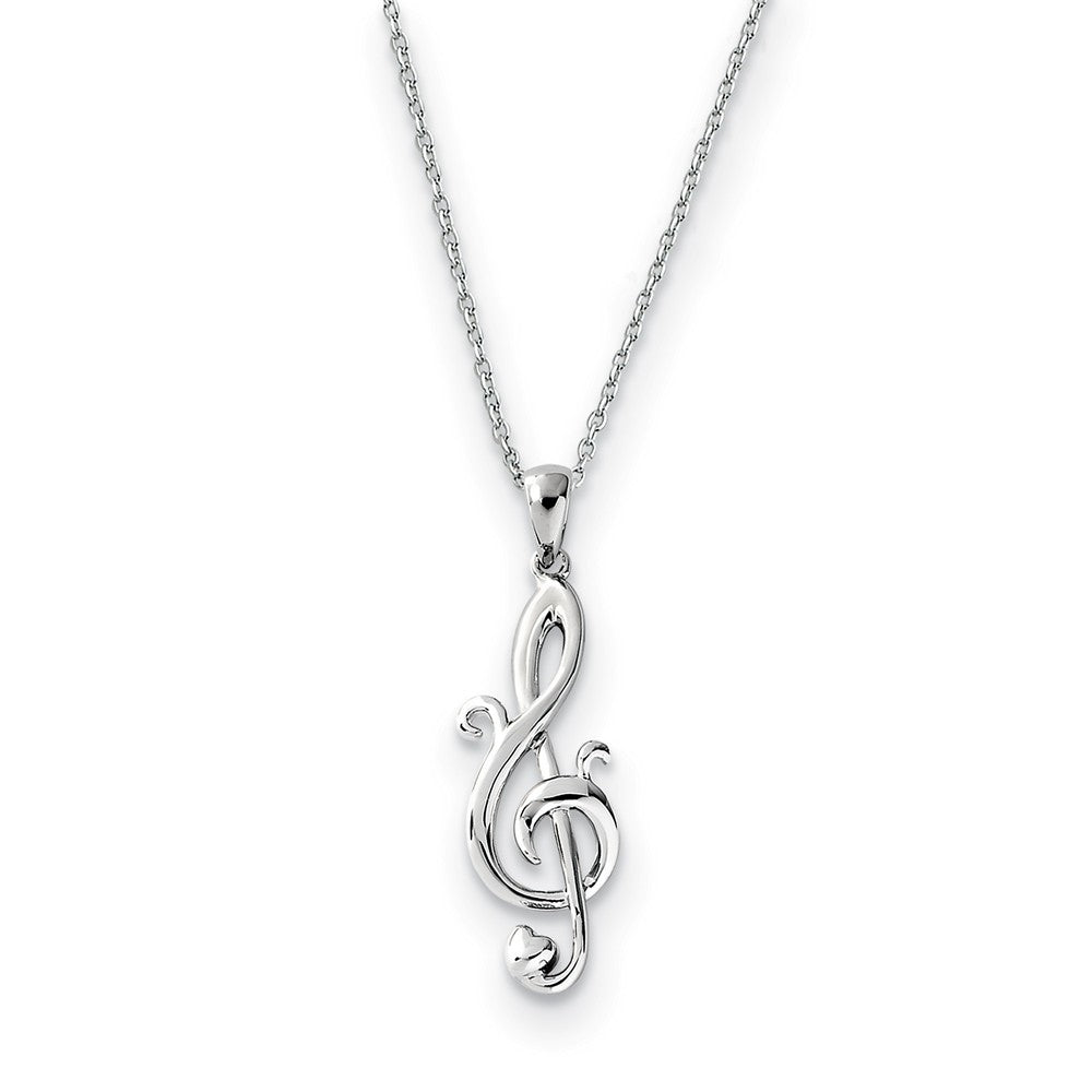 A graceful treble clef measuring 1-1/4 inches long with the bail is designed from rhodium plated sterling silver and comes complete on a matching 18 inch cable chain. Each necklace includes a card with the following poem written by the artist printed in English and Spanish. LOVE NOTES - There's a song in my heart that means everything. It's when I think of you Oh the joy that it brings. There's love in my heart each time I see your face. The love notes keep playing in this very special place. Contentment fills the air. My song carries on. In my heart I keep singing love notes in my song.