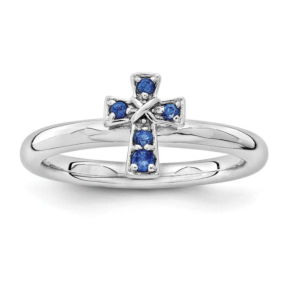 Customize a look that reflects your own unique style with a gemstone cross ring designed to celebrate your devout faith! This polished ring fashioned from tarnish resistant rhodium plated sterling silver features a 7 x 9mm cross prong set with a created blue sapphires and a 2.5mm width band. The synthetic gemstones are 1. Mm to 2mm in size and the total gemstone weight is .3 carats. Created sapphires like their natural counterparts can range from deepest midnight to brilliant cornflower blue so please allow for variations in color. Wear it alone or in meaningful combinations, guaranteed to fit together perfectly with all of the mix and match Stackable Expressions rings.
