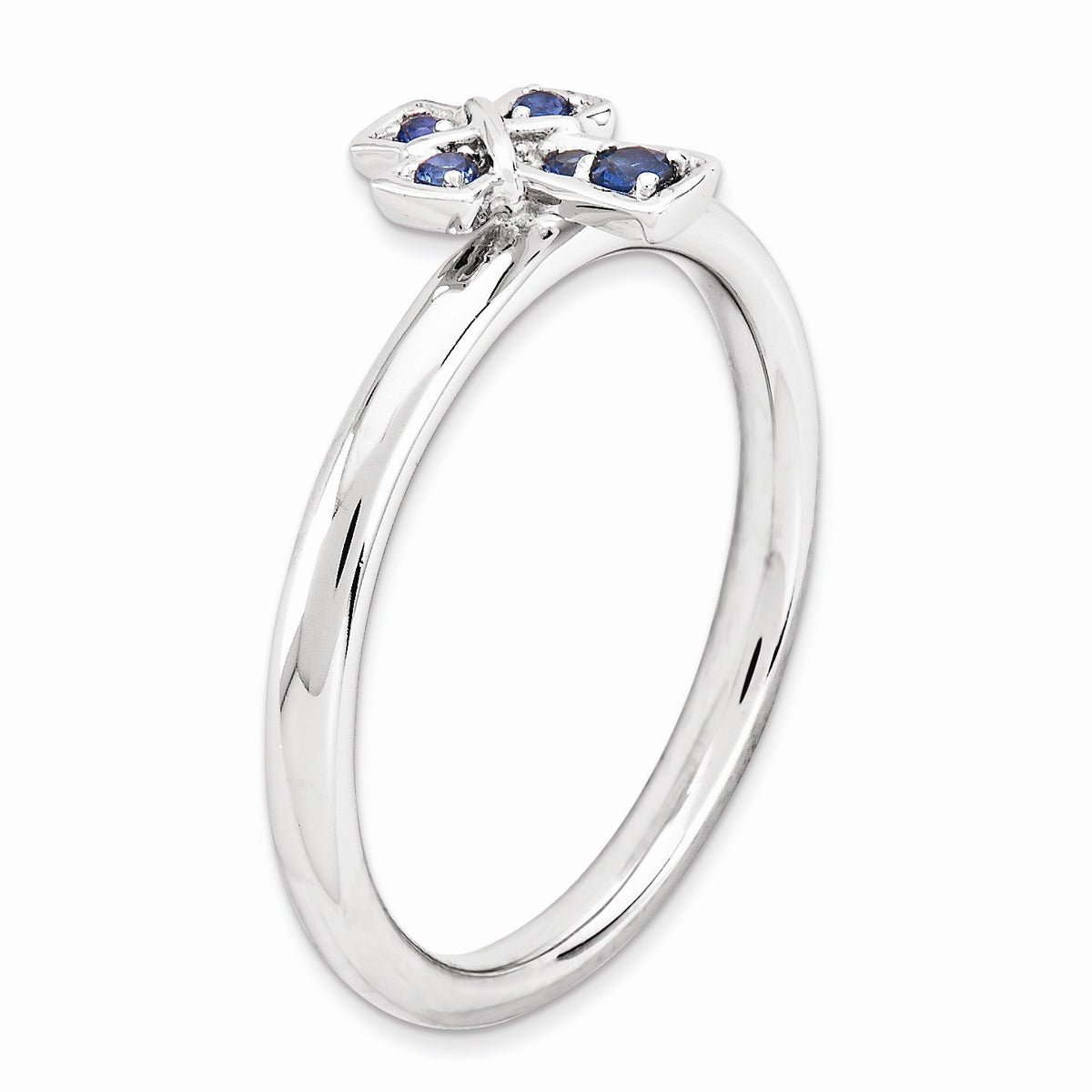 • Customize a look that reflects your own unique style with a gemstone cross ring designed to celebrate your devout faith! This polished ring fashioned from tarnish resistant rhodium plated sterling silver features a 7 x 9mm cross prong set with a created blue sapphires and a 2.5mm width band. The synthetic gemstones are 1. Mm to 2mm in size and the total gemstone weight is .3 carats. Created sapphires like their natural counterparts can range from deepest midnight to brilliant cornflower blue so please allow for variations in color. Wear it alone or in meaningful combinations, guaranteed to fit together perfectly with all of the mix and match Stackable Expressions rings.