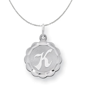 The brocaded disc with its contrasting satin and polished design adds a touch of glamour to your favorite initial. It is fashioned from solid sterling silver, finished with a classic jump ring that fits up to a 3mm width chain and has a polished back that is suitable for engraving. Includes a 1.25mm, 16 inch sterling silver cable chain.
