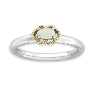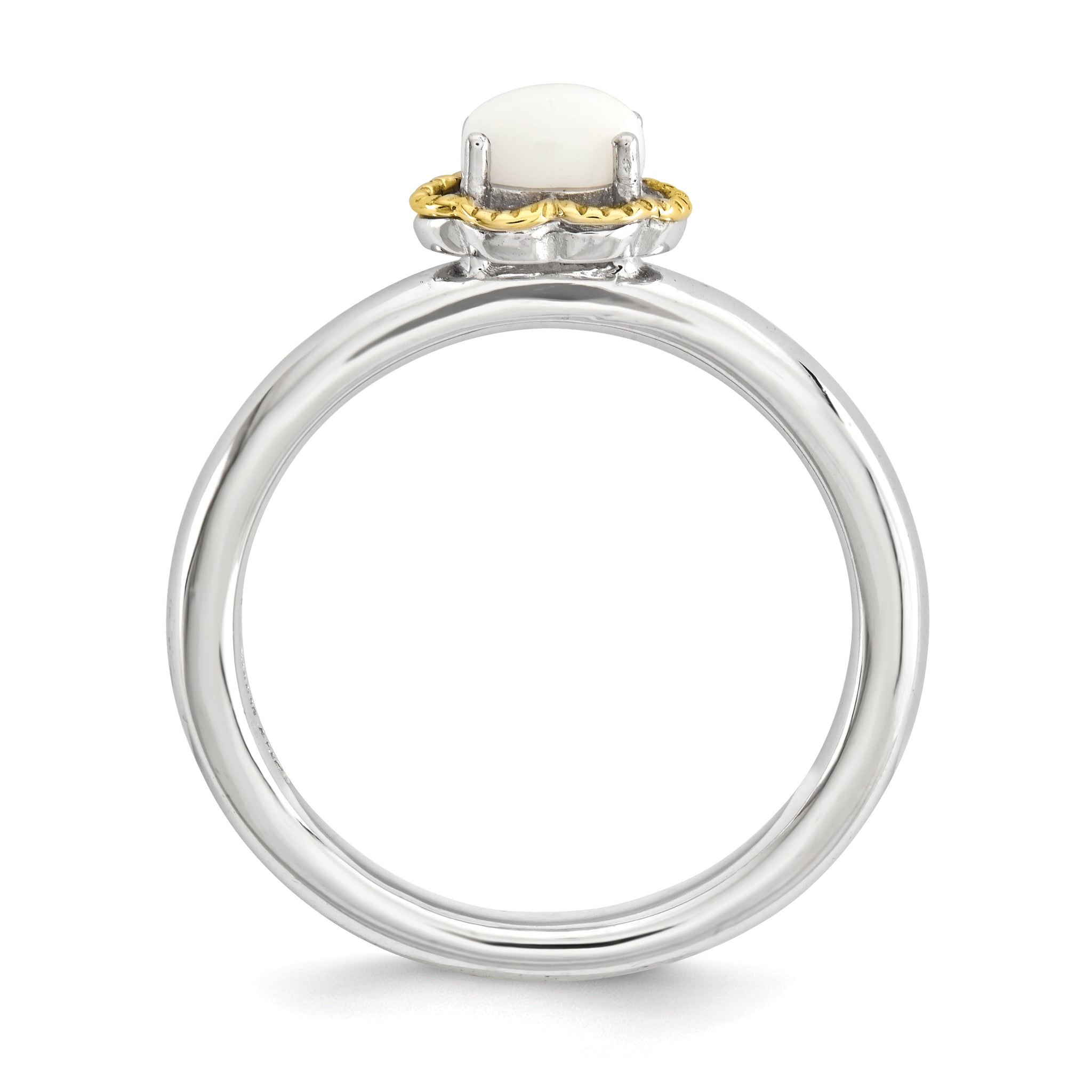 A polished white agate gemstone prong set in a horizontal mounting accented with 14k gold is displayed atop a 2.5mm polished sterling band featuring an anti-tarnish rhodium plated finish. Color range varies on all natural stones so please allow for slight variations in shades and size. Wear it alone as a solitaire or featured in a stacked collection. Guaranteed to fit together perfectly with all of the mix and match Stackable Expressions rings