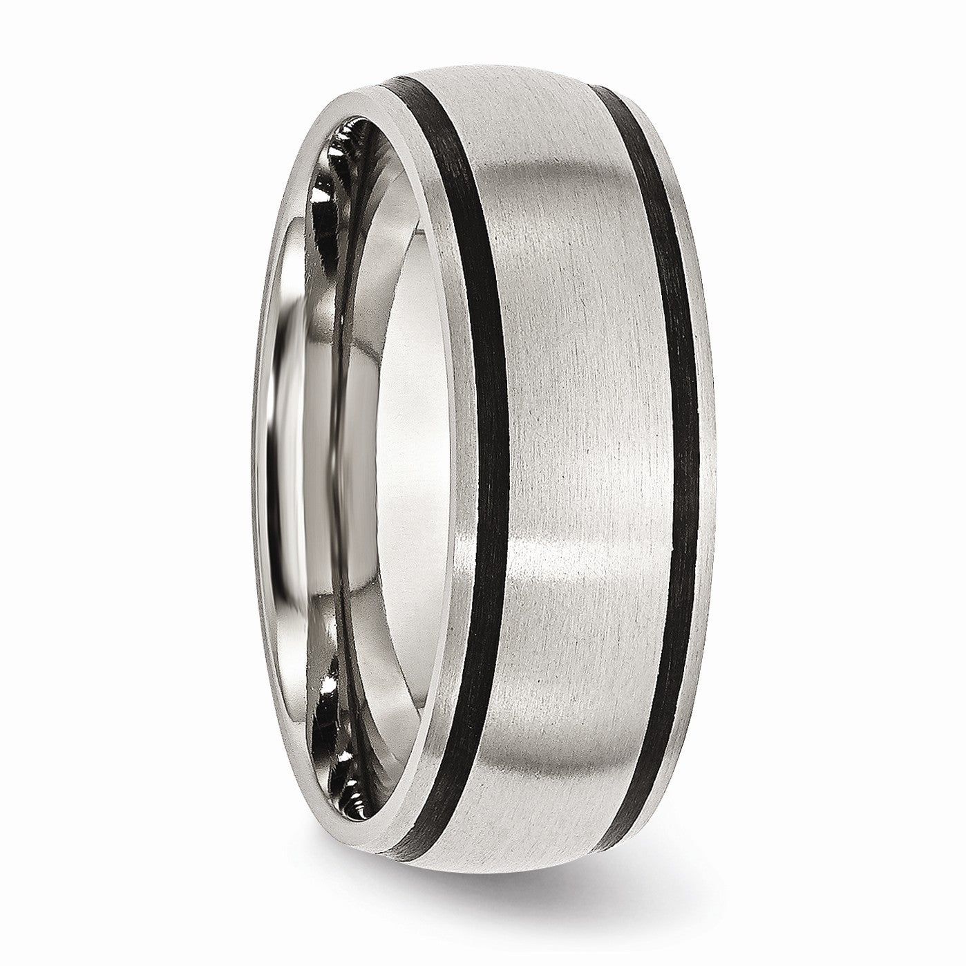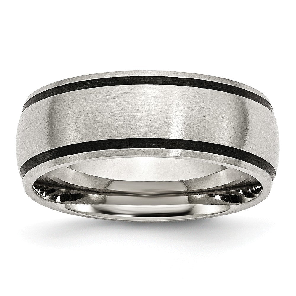 • This contemporary, unisex ring created from 316L stainless steel features a trendy, satin brushed finish with black rubber accent stripes. The domed band measures 8mm in width and has a standard fit shank. Available in whole and half sizes 6-13.