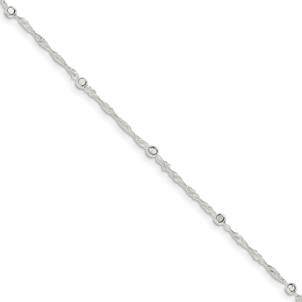 Sterling Silver 2mm Singapore And 3mm Bead Adj. Chain Anklet, 10 Inch