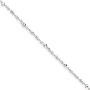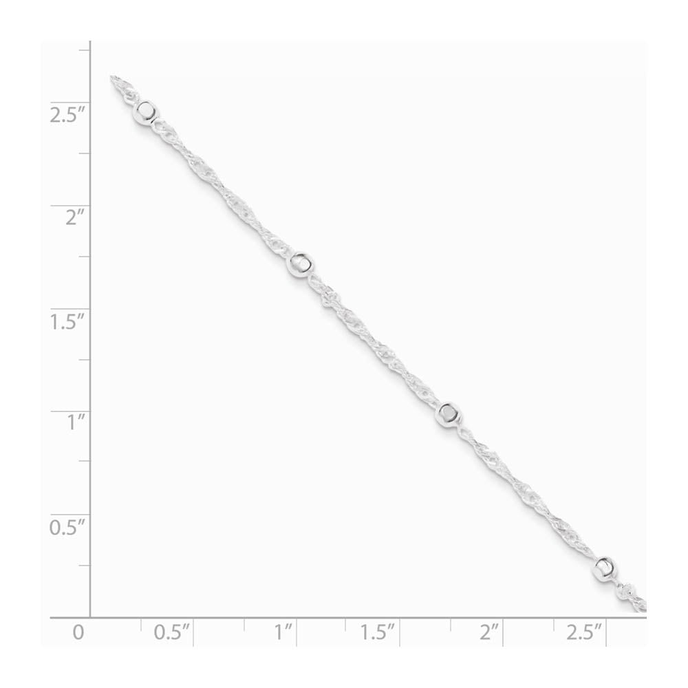 Dress up your ankles with a dainty, 2mm twisted Singapore and 3mm mirror bead chain anklet made from polished sterling silver. This one is 10 inches in length, includes a 1-inch extender so you can find the perfect fit, and closes with a classic spring ring clasp.