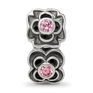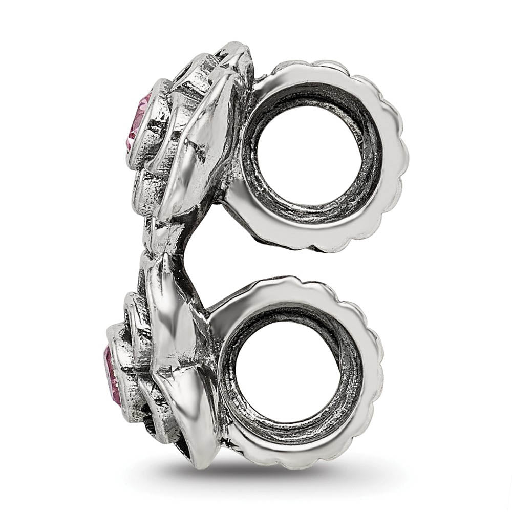 Make two bracelets into one with a fabulous, sterling silver connector charm to create a look that captures your own distinctive style and personality. Measuring 15 x 7 mm with a 4mm core, this floral charm features an antique finish with pink cubic zirconia embellishments and is interchangeable as well as compatible with Reflections and other popular 3mm width bead style bracelets and necklaces.