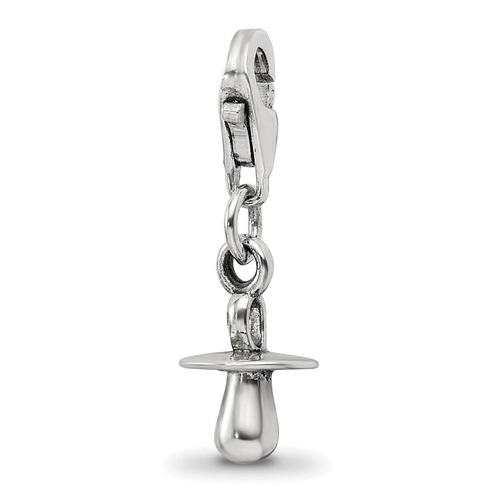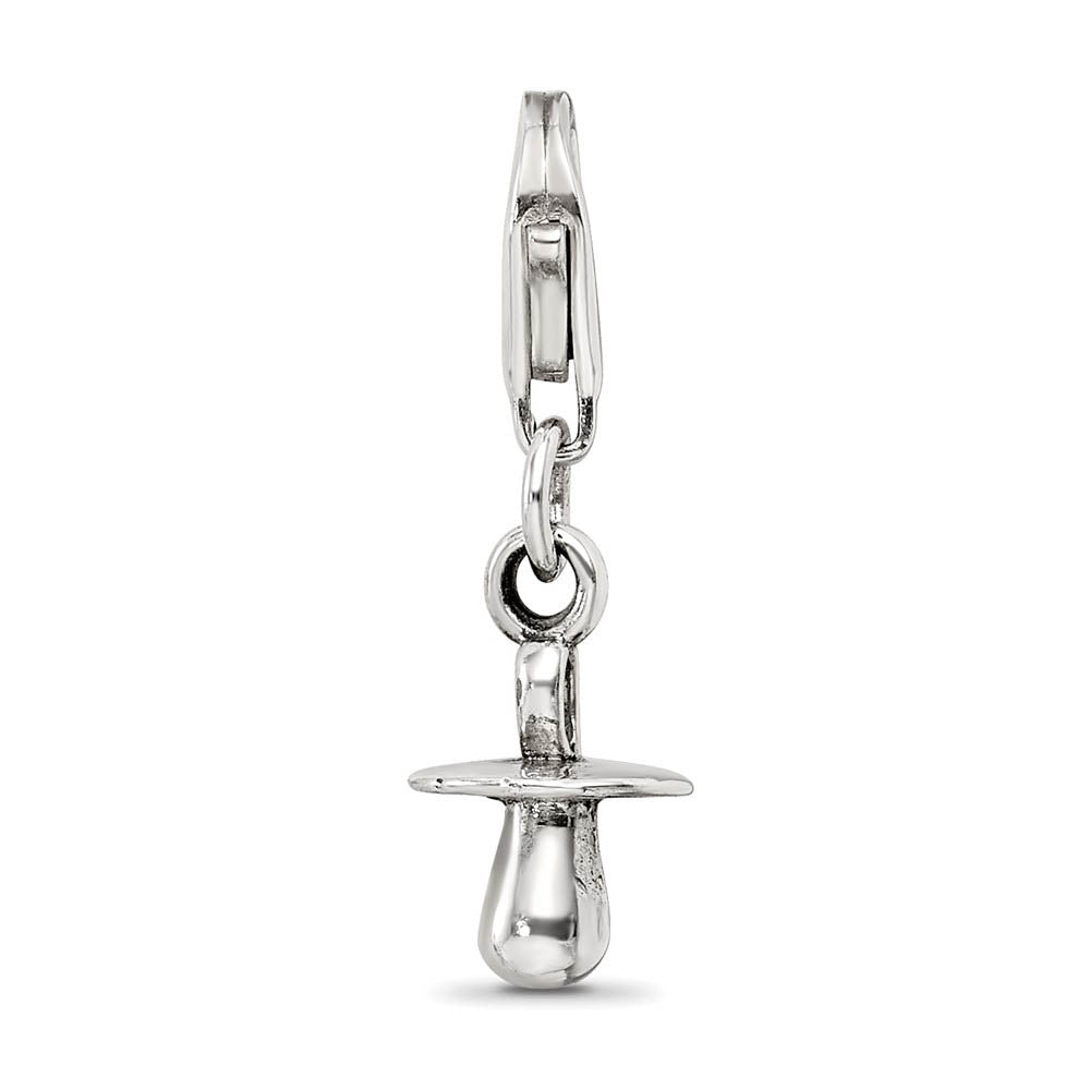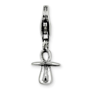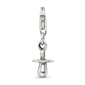 Dangling charms are a fun way to add movement and intrigue to your artisan expression jewelry. Fashioned from sterling silver with an oxidized finish to bring out every detail, this baby pacifier topped with a lobster clasp has a total hanging length of about 15mm and requires a looped charm holder to attach it to your bead bracelet or necklace.