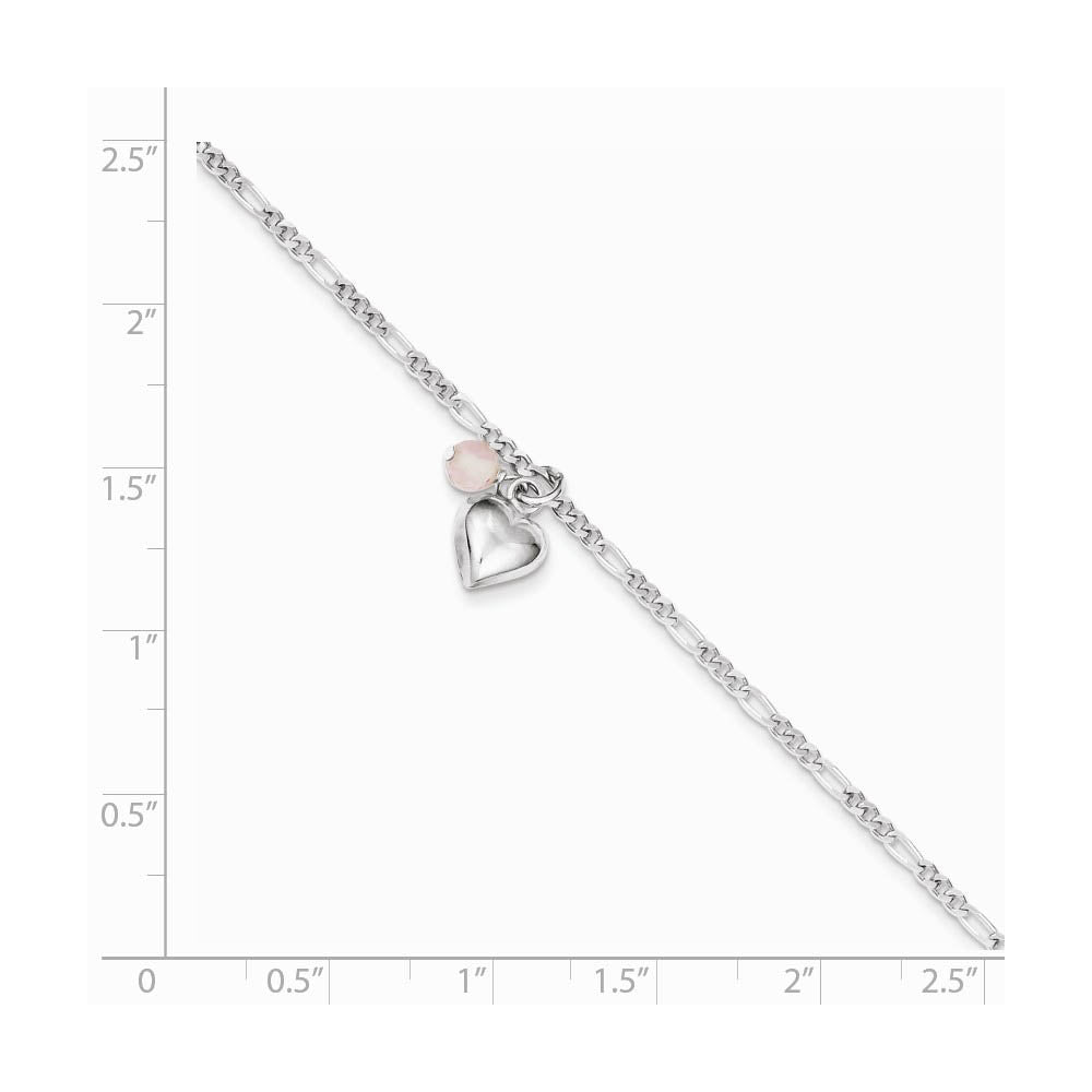Accessorize your ankles with a fabulous bracelet that combines color and movement with each step you take. Dangling from this 2mm width, 9-inch long sterling silver Figaro chain is a shiny, 8mm puffed heart accented with a 4mm cherry quartz bead. A spring ring clasp keeps this stylish anklet securely fastened.