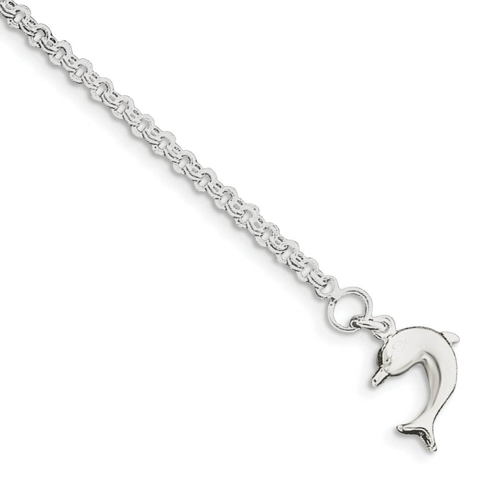 Incredibly fun to wear, a 13mm three-dimensional hollow dolphin created from sterling silver will swim above your foot in a carefree fashion. This 3mm width, 9-inch long double link cable chain secures to your ankle with a spring ring closure. Made in Italy.