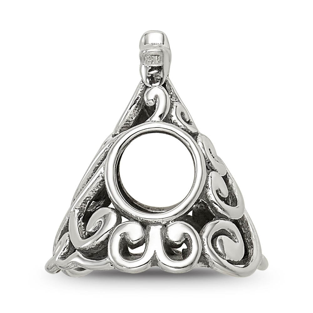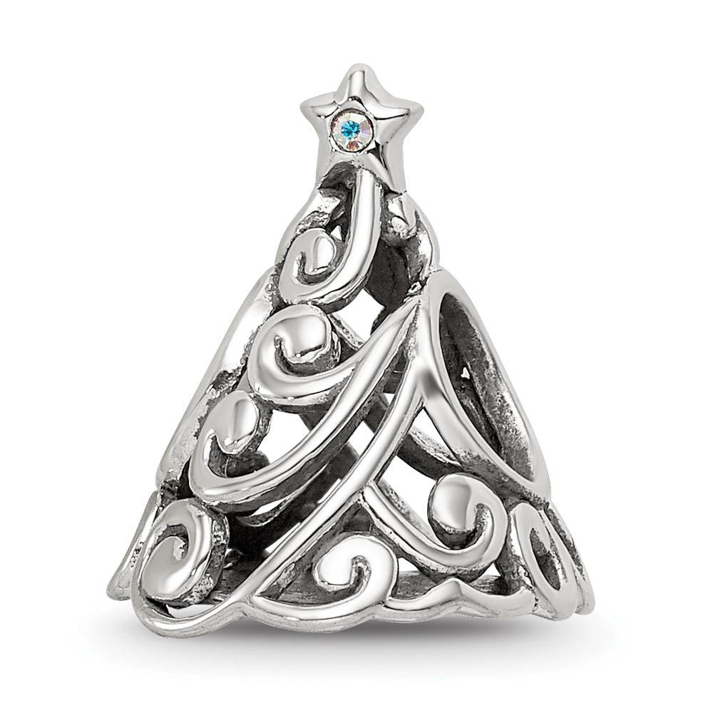 Celebrate the magic of Christmas with this sterling silver crystal accented charm featuring a open filigree tree design. It is approximately 12mm in width by 14mm in length and has a 4mm core that is interchangeable as well as compatible with other popular 3mm width bead style bracelets and necklaces.