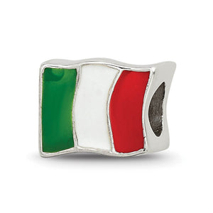 Display your love for Italy with this sterling silver flag charm finished with green, white and red enamel. It measures approximately 8 x 12mm with a 4mm center that is interchangeable as well as compatible with Reflections and other popular 3mm width bead style bracelets and necklaces. Due to the wide width, this charm will not fit on a Pandora bracelet.