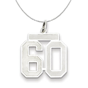 Celebrate your favorite sports player, lucky number or milestone date in your life with a prominent rhodium-plated sterling silver charm. Each laser-cut satin and polished number is approximately 15mm (9/16 inch) in length, which is finished with a 3mm top bar and classic jump ring that will accommodate up to a 3mm chain. Includes a 1.25mm, 16 inch sterling silver cable chain.