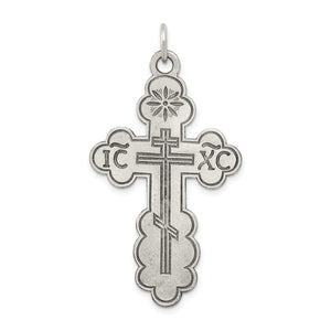 Celebrate and honor all special occasions with jewelry of religious significance! Our collection of spiritually inspired designs that show faith, hope and devotion are perfect for commemorating life's milestones. This large Eastern Orthodox cross pendant crafted in antiqued sterling silver features a solid, flat, antiqued and satin design. The approximate size is 20mm (3/4 inch) in width by 40mm (1 1/2 inches) in length with the bail. This item does not include a chain.