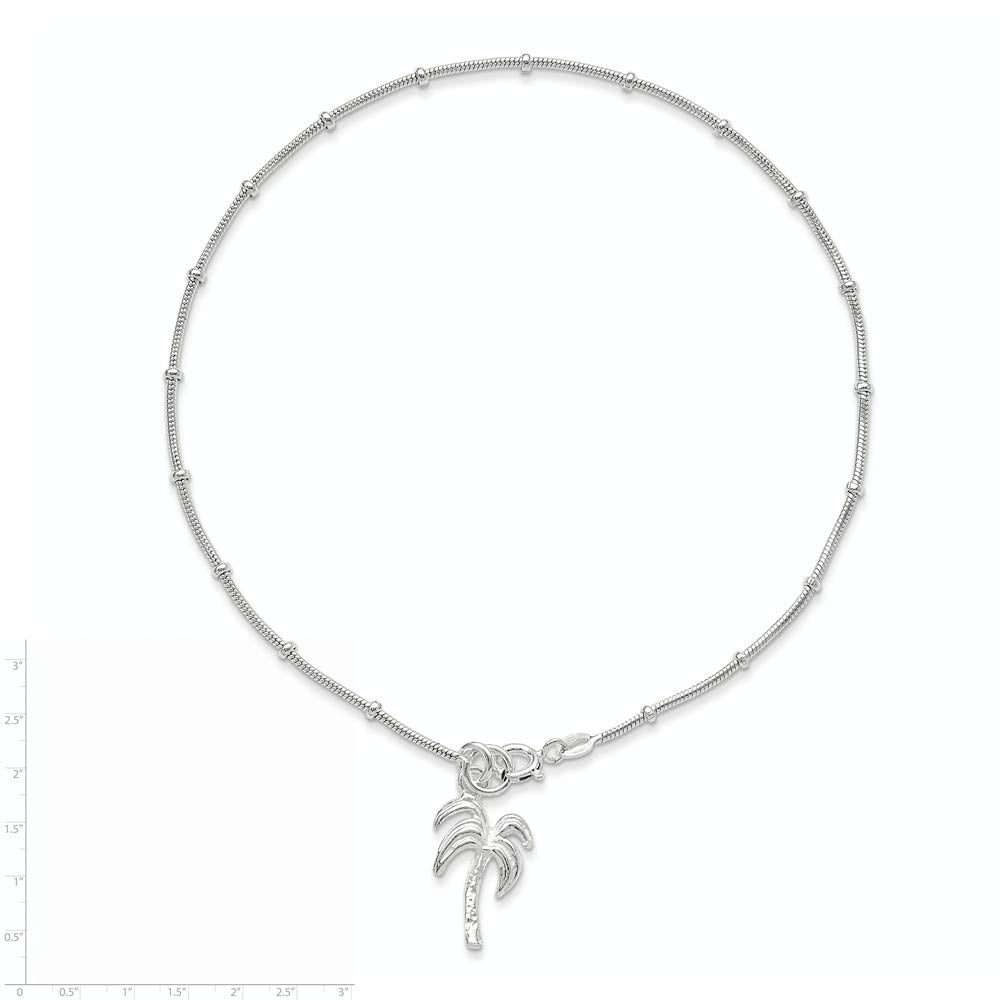 Treat yourself or a loved one to a breezy, tropical palm tree that brings to mind a paradise beach getaway. This 12 x 17mm, sterling silver charm dangles from a 1mm width, 9-inch long snake chain accented with 2mm beads that secures to your ankle with a spring ring clasp. Made in Italy.
