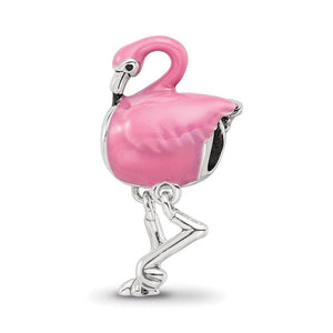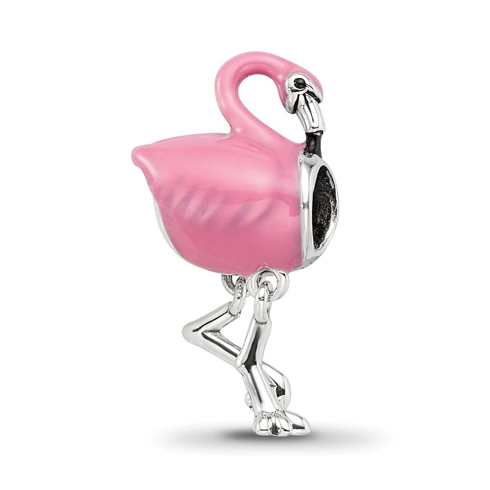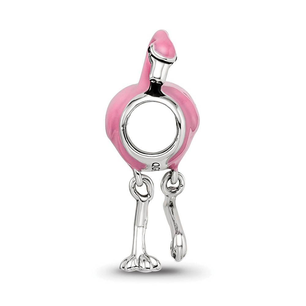 Start conversations wherever you go with a unique charm created to spark interest and reveal your individual style. This pink enameled flamingo charm fashioned from sterling silver features a three-dimensional dangling design that is approximately 8mm in width by 15mm in length and has a 4mm core. All of our charms are interchangeable as well as compatible with Reflections and other popular 3mm width bead style bracelets and necklaces.