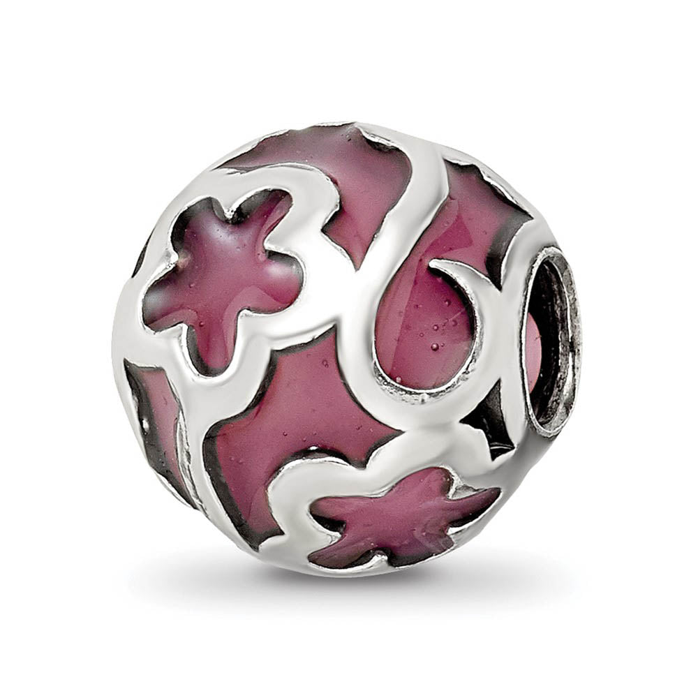 Brighten up your bead collection with a burst of color and uncover your hidden talent for jewelry design. This polished sterling silver charm featuring an intricate filigree swirl design accented with translucent purple enamel. It measures approximately 10mm in width by 10mm in length with a 4mm core that is interchangeable as well as compatible with Reflections and other popular 3mm width bead style bracelets and necklaces. Made in Italy.