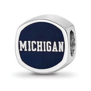 Show your school spirit with this University of Michigan cushion bead charm. It is crafted from rhodium plated sterling silver with blue enamel and measures approximately 10.9mm in width by 11mm in length. We are a certified retailer and this authentic item is officially licensed. This double sided bead charm is compatible with most major brand, 3mm width, bead style bracelets and necklaces. Enamel colors may vary slightly. The color on your screen may also not reflect actual color due to variations in monitors and browsers. Made in the U.S.A.