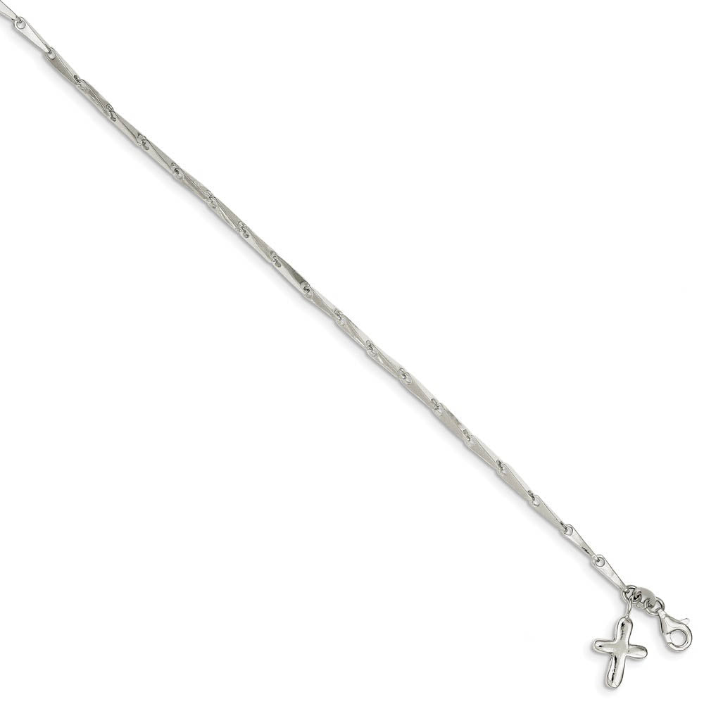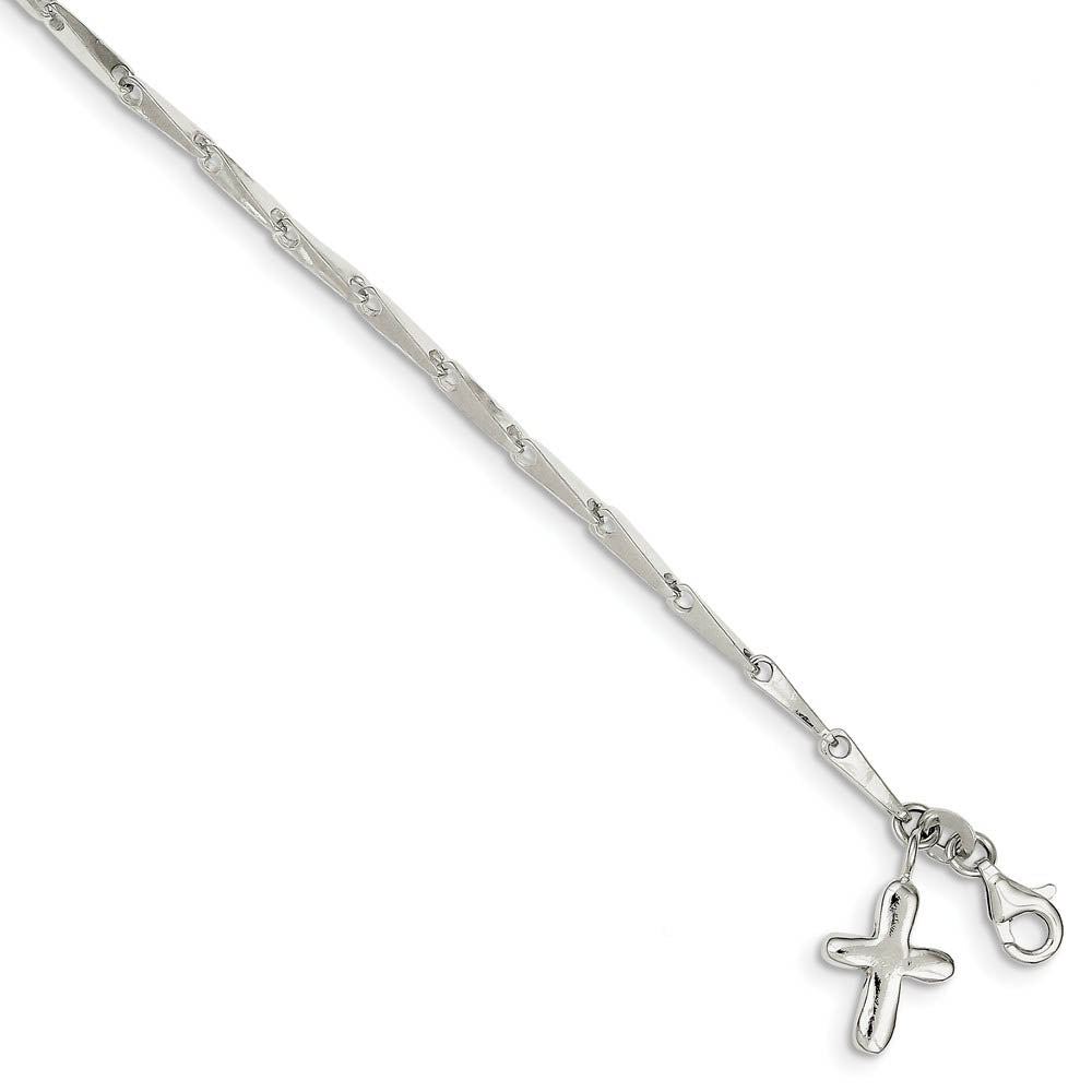Anklets are a great way to add fun, flash and a feminine touch. This 9-inch ankle bracelet crafted from polished sterling silver features a 3mm width solid fancy bar link chain, a dangling 9 x 14mm cross charm and a fancy lobster clasp.