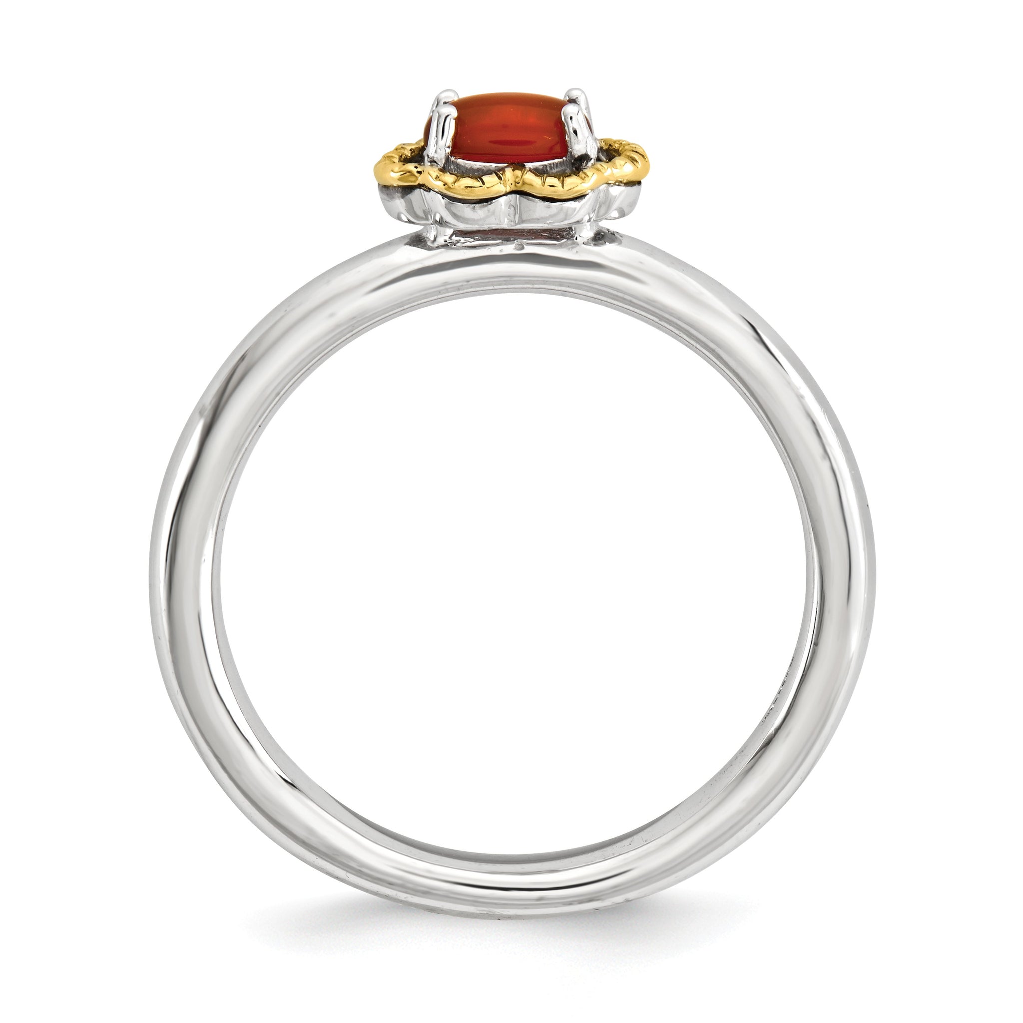 A polished red agate gemstone prong set in a horizontal mounting accented with 14k gold is displayed atop a 2.5mm polished sterling band featuring an anti-tarnish rhodium plated finish. Color range varies on all natural stones so please allow for slight variations in shades and size. Wear it alone as a solitaire or featured in a stacked collection. Guaranteed to fit together perfectly with all of the mix and match Stackable Expressions rings