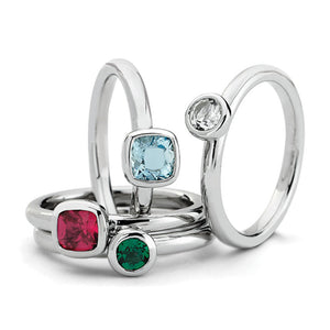 This set of four sterling silver rings features a tarnish resistant rhodium plated finish, a low profile mounting and bezel set gemstones. The total gemstone weight for all rings is 1.5 carats which includes a cushion-cut genuine blue topaz, a cushion-cut created ruby, a 4mm round created emerald and a 4mm round genuine white topaz. When worn all together this stack measures 9mm in width.