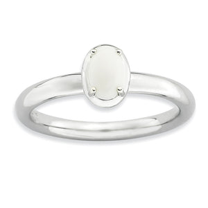 • Simply elegant! A polished white agate cabochon is vertically mounted on a 2.5mm gleaming sterling silver band featuring an anti-tarnish rhodium plated finish. Wear it alone as a solitaire or featured in a stacked collection. Guaranteed to fit together perfectly with all of the mix and match Stackable Expressions rings.