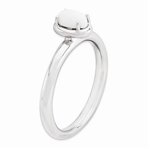 Simply elegant! A polished white agate cabochon is vertically mounted on a 2.5mm gleaming sterling silver band featuring an anti-tarnish rhodium plated finish. Wear it alone as a solitaire or featured in a stacked collection. Guaranteed to fit together perfectly with all of the mix and match Stackable Expressions rings.
