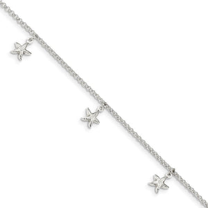 Anklets are a great way to add fun, flash and a feminine touch. This polished dangle design made from sterling silver features a 1.5mm width rolo chain, and dangling 7mm (1/4 inch) textured starfish charms. It is adjustable in length from 9 to 10 inches and closes with a fancy lobster clasp.