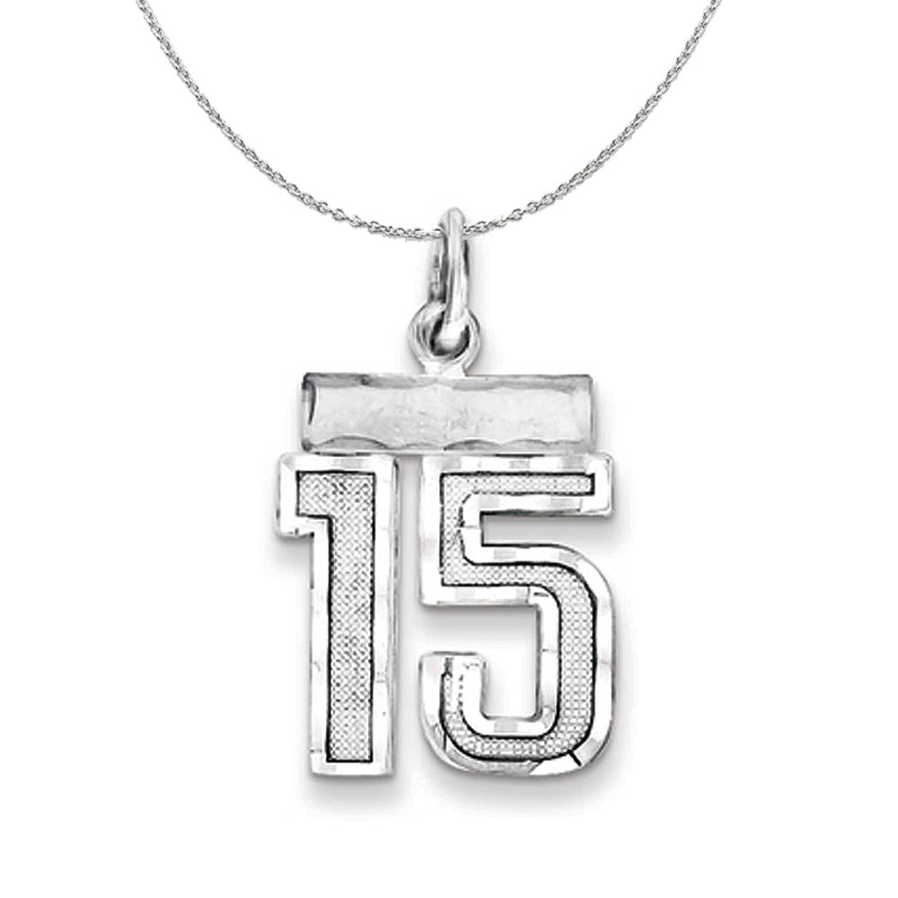 • Celebrate your favorite sports player, lucky number or milestone date in your life with a prominent rhodium-plated sterling silver charm. Each satin and diamond cut number is approximately 12mm (7/16 Inch) in length, which is finished with a 3mm top bar and classic jump ring that will accommodate up to a 3mm chain. Includes a 1.25mm, 20 inch sterling silver cable chain.