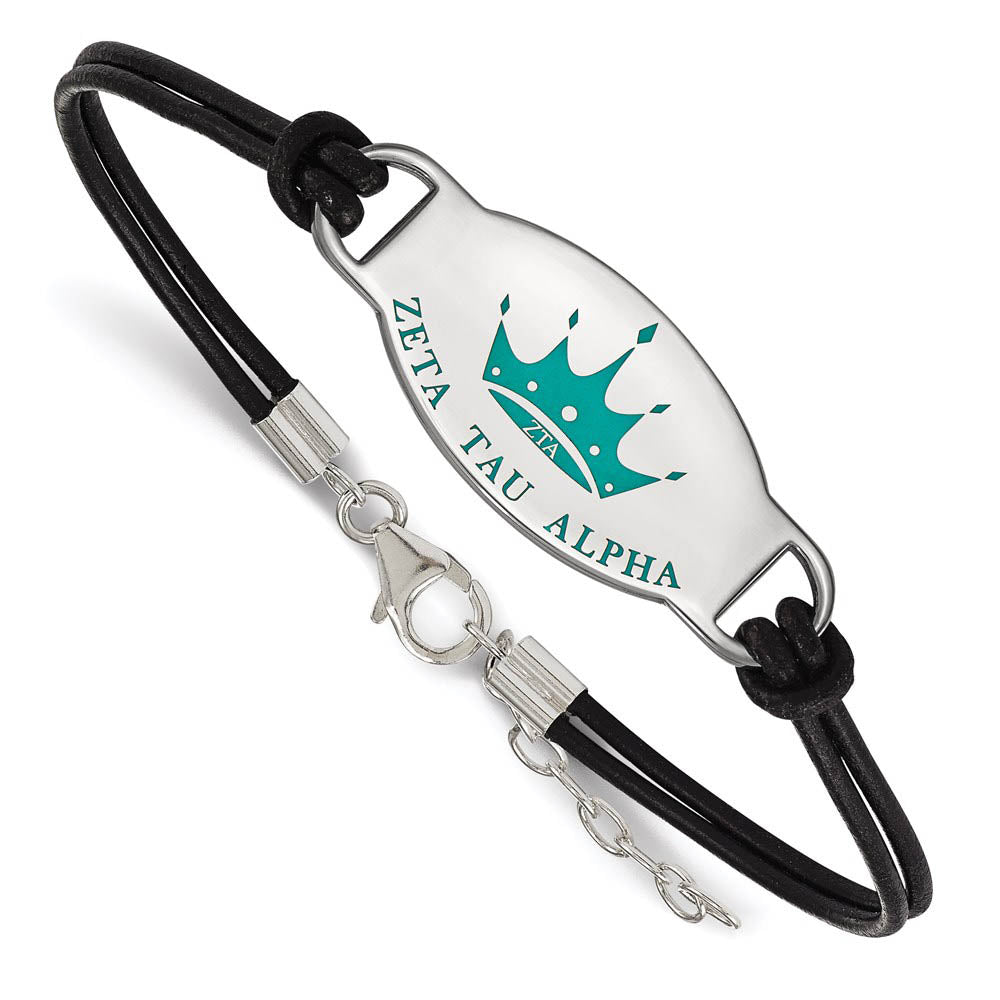 Sterling Silver Zeta Tau Alpha Enamel Black Leather Bracelet - 7 in.