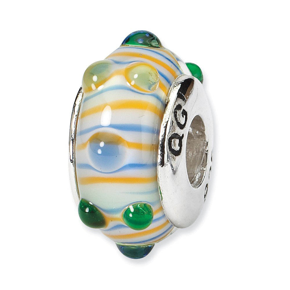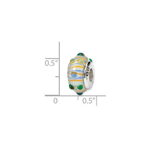 Artistic glasswork charms with unique, creative designs are available in a variety of amazing colors and because they are hand-blown, no two pieces will be exactly alike. Measuring 13.25mm in diameter, this gorgeous blue, green and yellow striped charm with its lustrous finish features a 4mm core that is interchangeable as well as compatible with Reflections and other popular 3mm width bead style bracelets and necklaces.