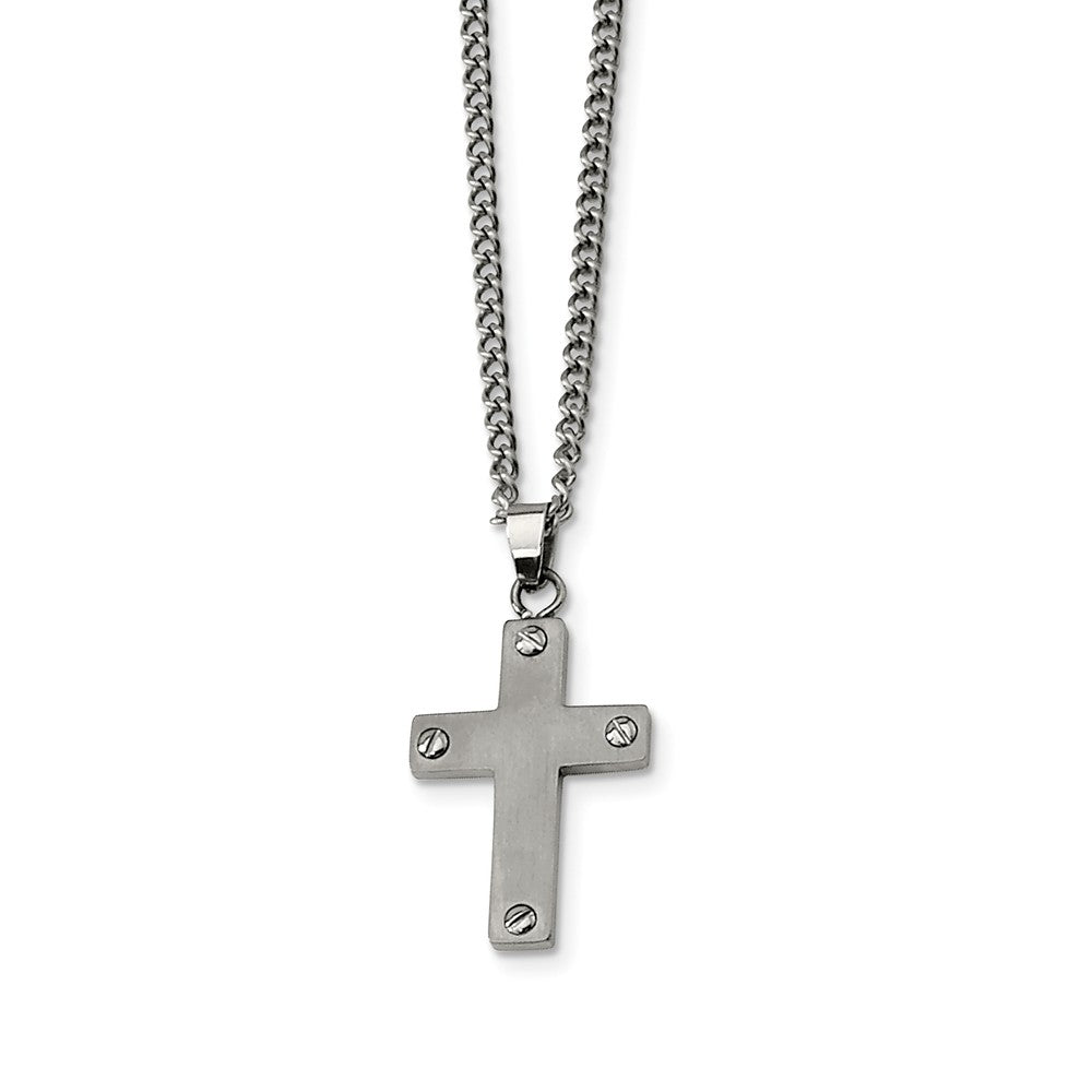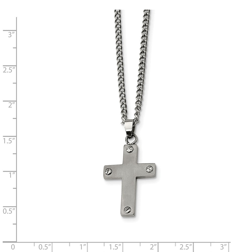 Divine inspiration! A brushed titanium Latin cross featuring polished screw accents on each arm hangs on 2mm, 22 inch stainless steel curb chain finished with a fancy lobster clasp. The pendant measures approximately 3/4 inches by 1 3/8 inch including the bail.