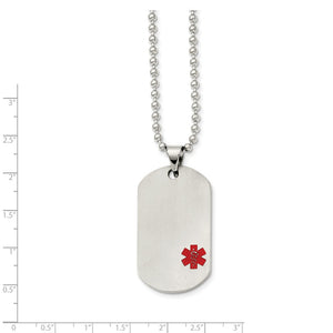 Obtain peace of mind should a medical emergency arise with a potentially life-saving necklace. A titanium dog tag featuring a red enamel alert emblem hangs from a 2mm, 22-inch stainless steel ball chain finished with a fancy lobster clasp. The pendant measures 25 x 42mm and is suitable for engraving.