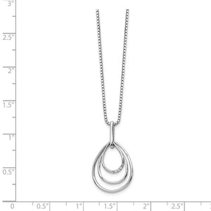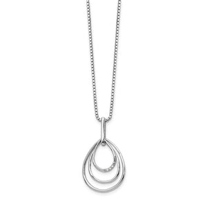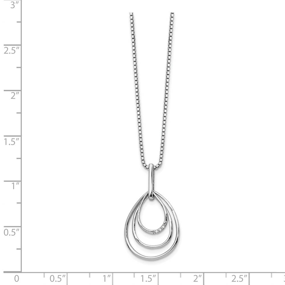 A timeless classic design featuring a diamond accented triple teardrop pendant, one of which is irregular in shape, with an adjustable chain made from tarnish resistant, rhodium plated sterling silver. The polished pendant is approximately 17mm (5/8 inch) in width by 26mm (1 inch) in length, which includes the bail. It comes ready to wear on 1mm width, 18 inch long box chain finished with a spring ring clasp and 2-inch extension for flexibility. The natural diamonds are I2 in clarity, H-I in color and the combined weight is .01 carat.