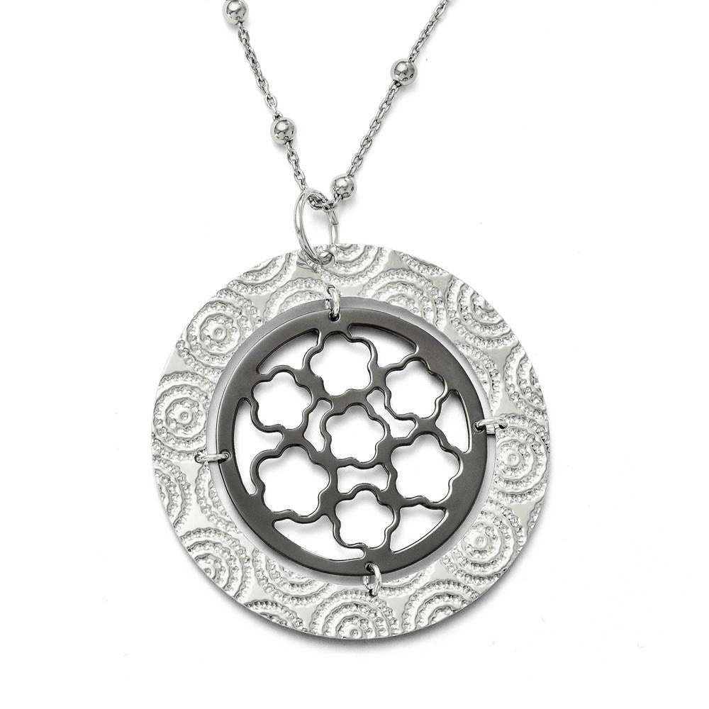Italian artistry and craftsmanship complement the bold styling and elegance in this unique two-tone necklace made from sterling silver and black ruthenium plating. It features a textured and cutout pendant that is approximately 44mm (1 3/4 inch) in diameter and a 1mm, 17-inch cable link chain enhanced with 3mm beads that fastens with a fancy lobster clasp. Made in Italy.