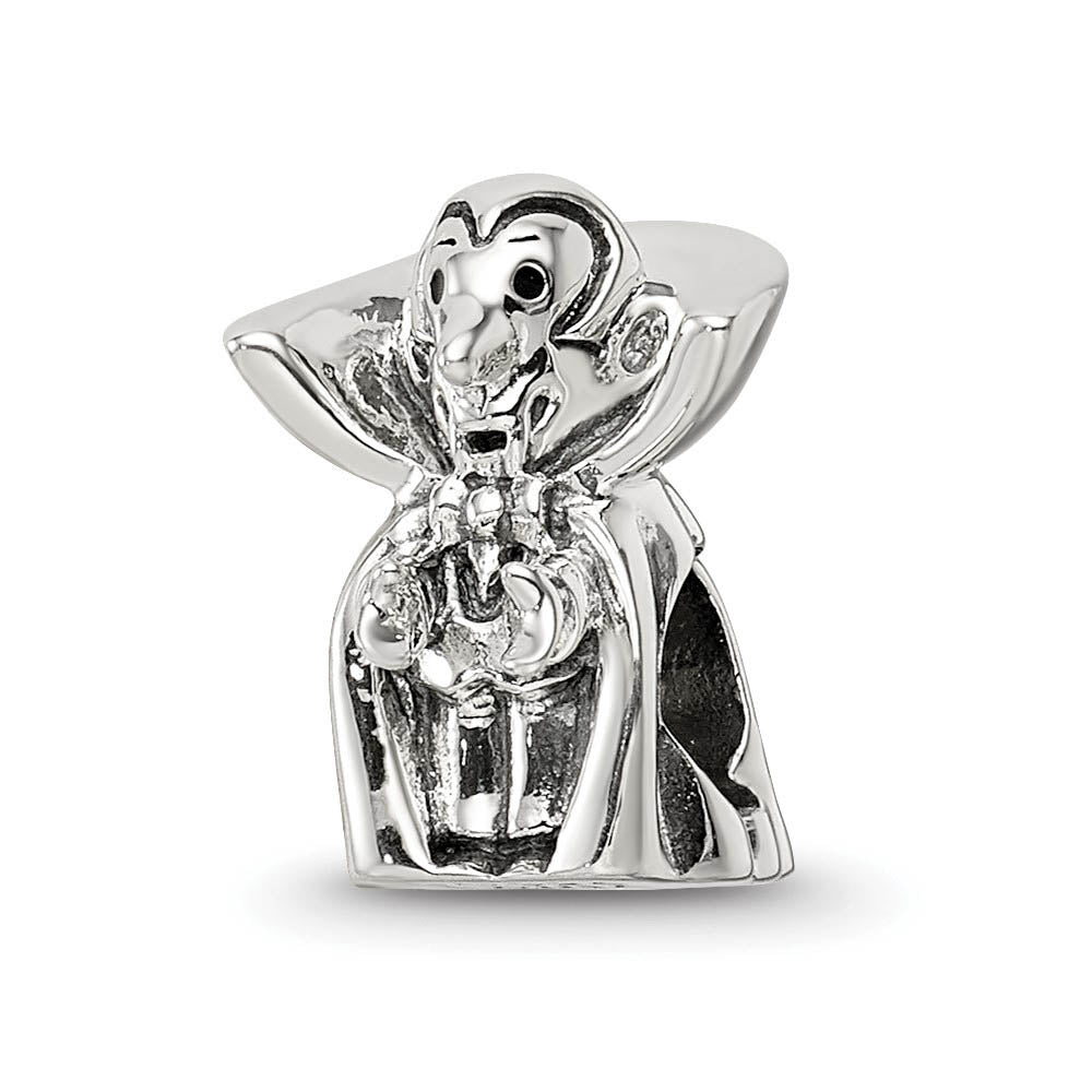 Celebrate the spooky fun of Halloween with this antiqued sterling silver charm featuring a caped vampire design. It is approximately 9mm in width by 14mm in length and has a 4mm core that is interchangeable as well as compatible with Reflections and other popular 3mm width bead style bracelets and necklaces.