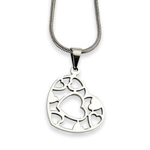 This unique heart necklace is crafted from stainless steel with a polished finish. The pendant measures 1-5/8 inches x 1-1/8 inches and the 2mm snake chain finished with a fancy lobster clasp measures 18 inches in length.
