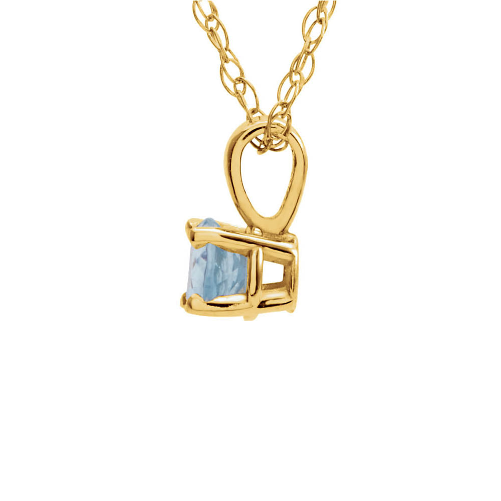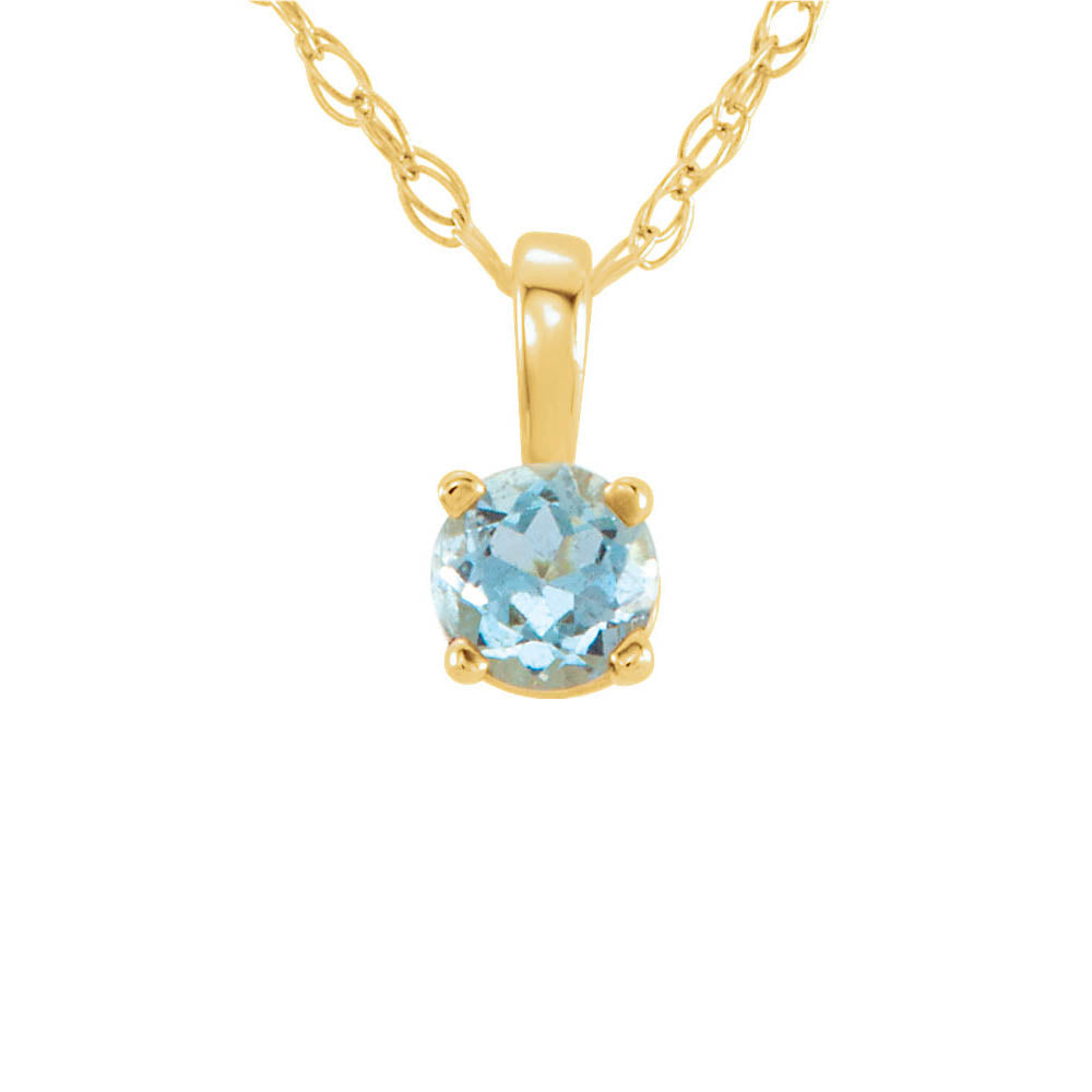 Aquamarine is the modern gem most often used to celebrate those born in March and reflects a youthful vitality. This classic 14-inch girls necklace features a faceted 3mm round gemstone in a four-prong basket setting and a 0.75mm width solid loose rope chain finished with a spring-ring clasp made of 14k yellow gold. The genuine aquamarine is heat-treated and the stone weight is approximately 1/10 carat. The color range varies on all natural stones so please allow for slight variations in shades (pale blue-green to nearly colorless). This is a made to order item and is estimated to ship in about 6-8 days. Please email service@theblackbow.com for more details.