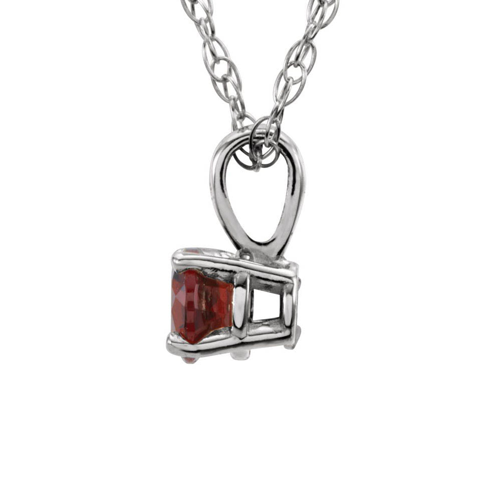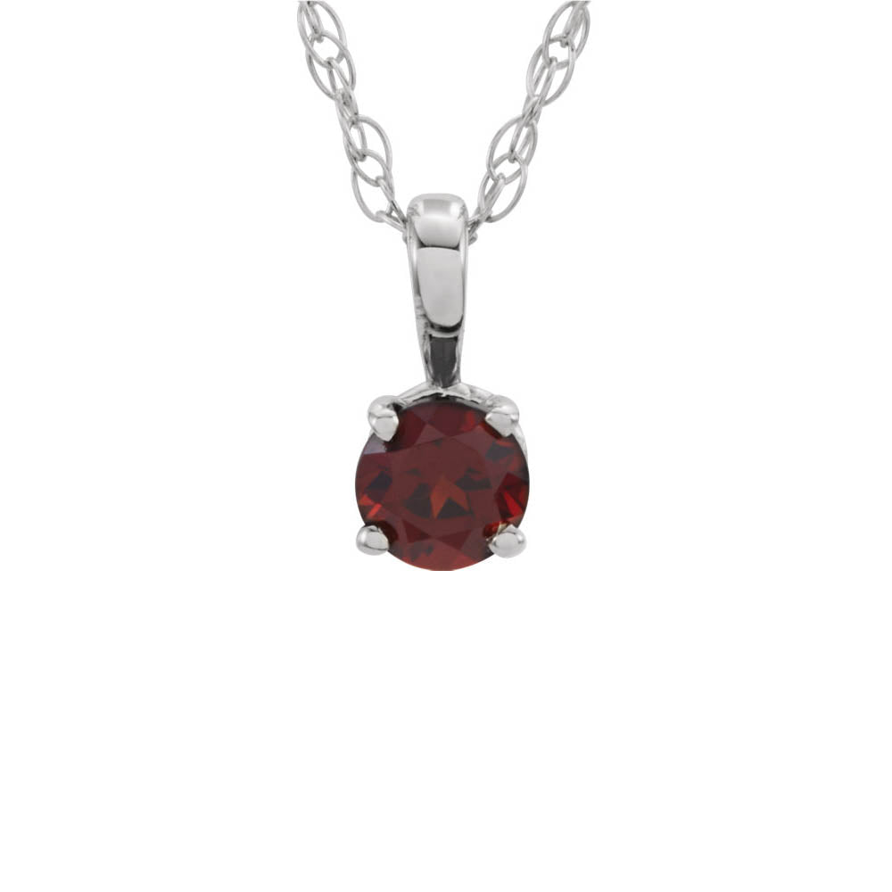 Mozambique Garnet, glowing deep red with hints of orange and brown, reminds us of autumn and is the gem most often used to celebrate those born in January. This classic 14-inch girls necklace features a faceted 3mm round gemstone in a four-prong basket setting and a 0.75mm width solid loose rope chain finished with a spring-ring clasp made of 14k white gold. The genuine garnet is untreated and the stone weight is approximately 0.14 of a carat. The color range varies on all natural stones so please allow for slight variations in shades. This is a made to order item and is estimated to ship in about 6-8 days. Please email service@theblackbow.com for more details.